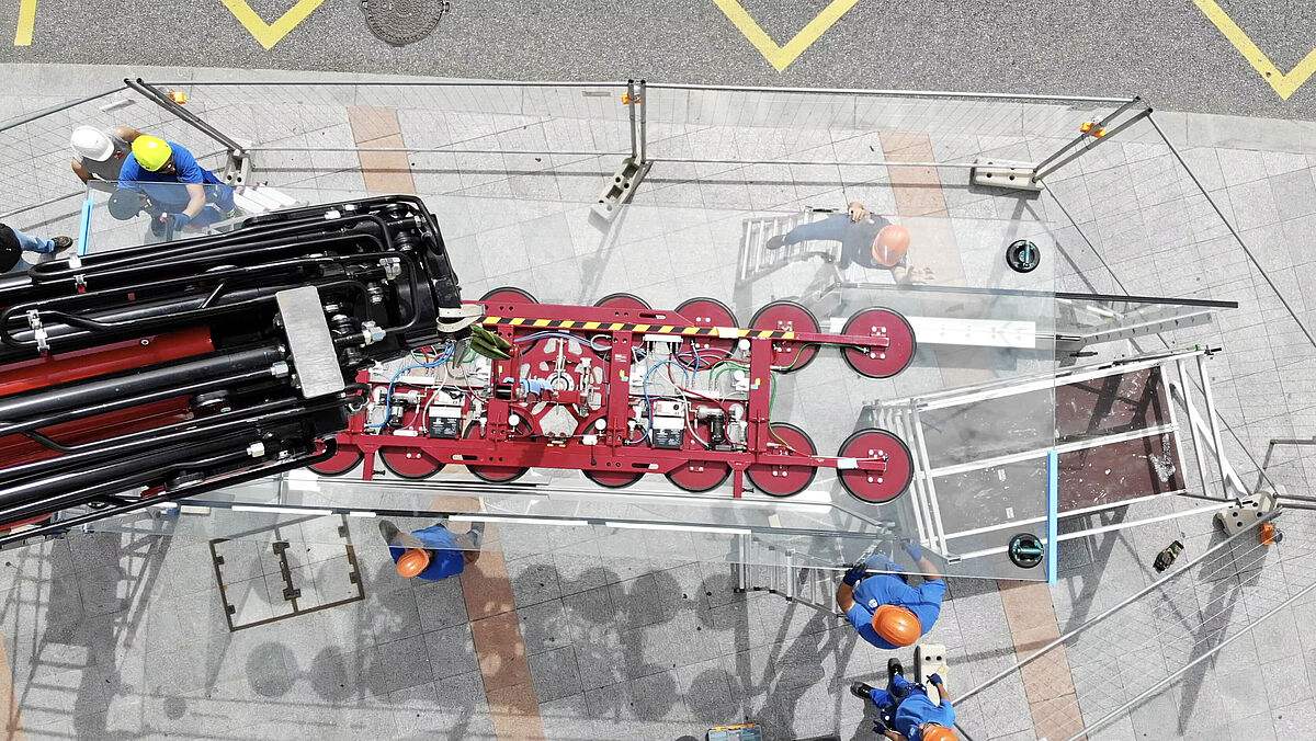 La lastra di copertura è composta da quattro lastre di vetro indurito unificate e stratificate mediante pellicole ionoplastiche (SGP). Questa tipologia di pellicola risulta più rigida, resistente e stabile alle sollecitazioni da temperatura ed è impiegata al posto delle pellicole in PVB nel caso di strutture particolari o che devono garantire una maggiore resistenza nel caso in cui si verifichi una rottura delle lastre. Grazie a queste pellicole è stato possibile applicare una predeformazione verso l’alto dello spigolo libero frontale della lastra.