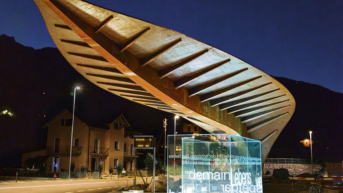 La pensilina in acciaio Cor-Ten, progettata dall’architetto Davide Conceprio, ed elegantemente realizzata dalla ditta Officine Ghidoni SA, è a servizio degli utenti dei mezzi pubblici, funge da riparo dagli agenti atmosferici e ha la forma di una foglia. Un rimando all’importanza del castagno nel passato: l’albero del pane nell’economia rurale, materia prima legata alla manifattura di utensili da lavoro e oggetti d’uso quotidiano.