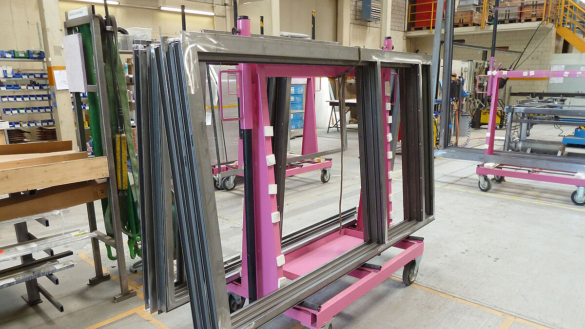 Les éléments de cadre finis quittent ensuite la partie production munis des documents nécessaires pour être déposés sur des chariots spécialement conçus en vue du traitement de surface extérieur. L’enlèvement du cadre brut et sa restitution après le laquage sont effectués de manière autonome par le transporteur de l’usine de laquage.