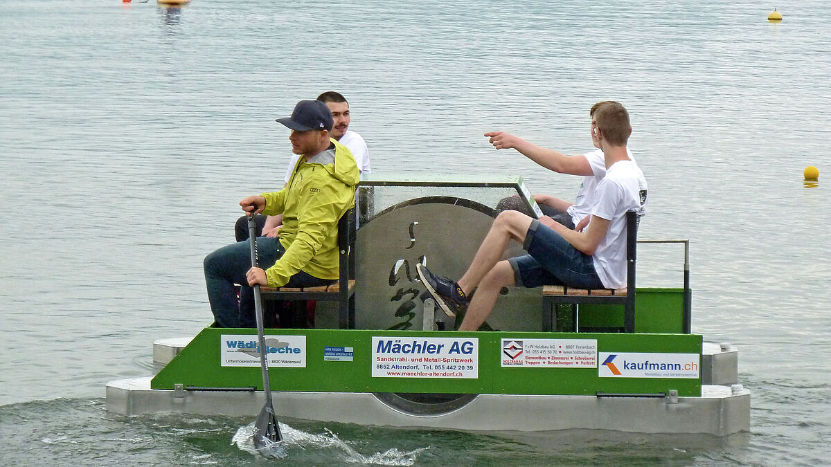 Rolf Züger, maître professionnel en construction métallique au BBZP de Pfäffikon (SZ), dirige depuis 22 ans des projets pluridisciplinaires connus dans tout le pays en 3e année d’apprentissage de construction métallique. Cette 22e réalisation a dépassé toutes les attentes, et peut-être même celle de Léonard de Vinci. Le célèbre érudit avait mis sur papier une idée de catamaran à roues à aubes, que les futurs constructeurs métalliques ont développé et construit.