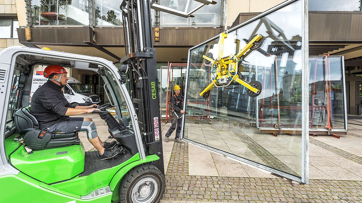Le remplacement spectaculaire de la façade a été réalisé à l’aide de plateformes élévatrices et de grues. Il s’agissait ici de retirer une « bande de verre » verticale à la fois et d’y installer directement les nouvelles vitres. 54 de ces éléments mesurent 3,20 m x 2,80 m et pèsent environ 550 kg chacun, soit 300 kg de plus que les anciennes vitres prises individuellement. 36 vitres supplémentaires de différentes tailles ont été installées sur les bords et les côtés de la façade. Il a été possible de réutiliser les supports et cadres d’origine.