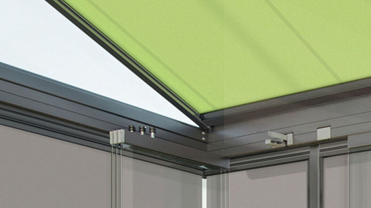 Les stores toile de fenêtres conviennent aussi parfaitement pour les angles des jardins d’hiver. Ils sont à la fois esthétiques et fonctionnels : aucune fixation supplémentaire n’est requise dans les angles, car les deux toiles sont reliées entre elles par le caisson et la lame finale, de sorte qu’elles peuvent monter ou descendre simultanément avec un seul moteur. ■