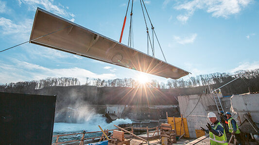Le clapet à ventre de poisson commande le niveau de rétention de l’eau dans les centrales hydrauliques. Il doit son nom à sa forme courbée qui rappelle le ventre d’un poisson et qui le rend particulièrement rigide à la torsion. C’est précisément ce qui avait été demandé pour ce projet. Deux clapets pivotants, qui mesurent 44 mètres de long chacun, sont reliés sur la partie avant à la paroi latérale du barrage à l’aide d’un mécanisme de réglage hydraulique. Par ailleurs, les clapets de 2,5 mètres de hauteur environ sont reliés au seuil du barrage à l’aide d’un axe de rotation. Cela permet de lever et d’abaisser le clapet à ventre de poisson et donc de régler rapidement le niveau d’eau.