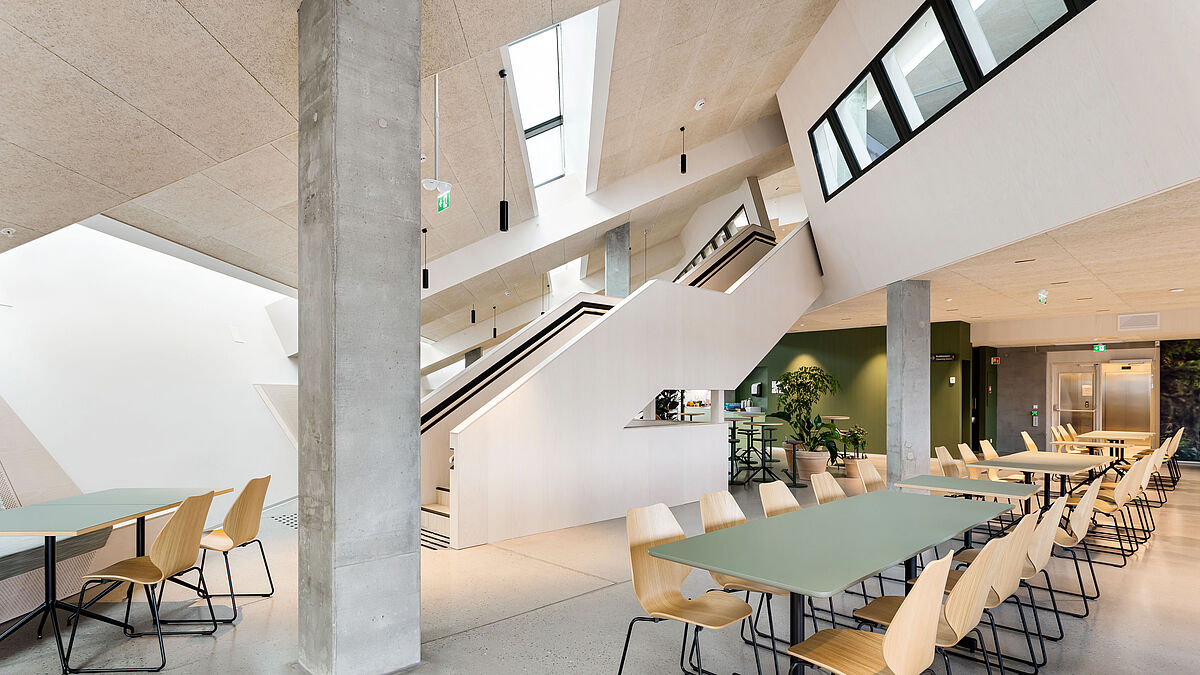 Pour mieux exploiter la lumière naturelle et optimiser la consommation d’énergie, les bureaux sont agencés de manière à tirer le meilleur profit de la lumière du jour. Ainsi, les espaces de bureaux fermés ont été placés au nord et à l’est, tandis que les bureaux ouverts et flexibles donnent vers le sud et l’ouest. L’habillage en bois ajouré sur les façades protège naturellement les postes de travail du soleil et de l’éblouissement tout en contribuant à ce que les murs extérieurs ne chauffent pas inutilement. Ces mesures low-tech ont permis de réduire la consommation d’énergie nette de la Powerhouse Telemark de 70 % par rapport aux nouvelles constructions similaires.