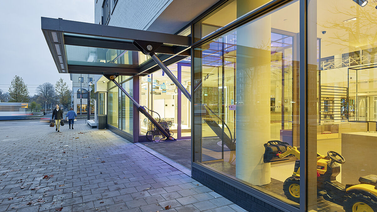 « Préserver et compléter » : telle était l’idée à la base de la réaffectation du bâtiment Citroën. Il n’est pas facile de distinguer les parties du bâtiment qui ont été conservées de celles qui ont été ajoutées. Parmi ces dernières, on retrouve une construction poteaux-traverses entièrement vitrée en profilés d’acier cintrés en plan ainsi qu’une porte qui pivote vers le haut dans la façade du rez-de-chaussée.