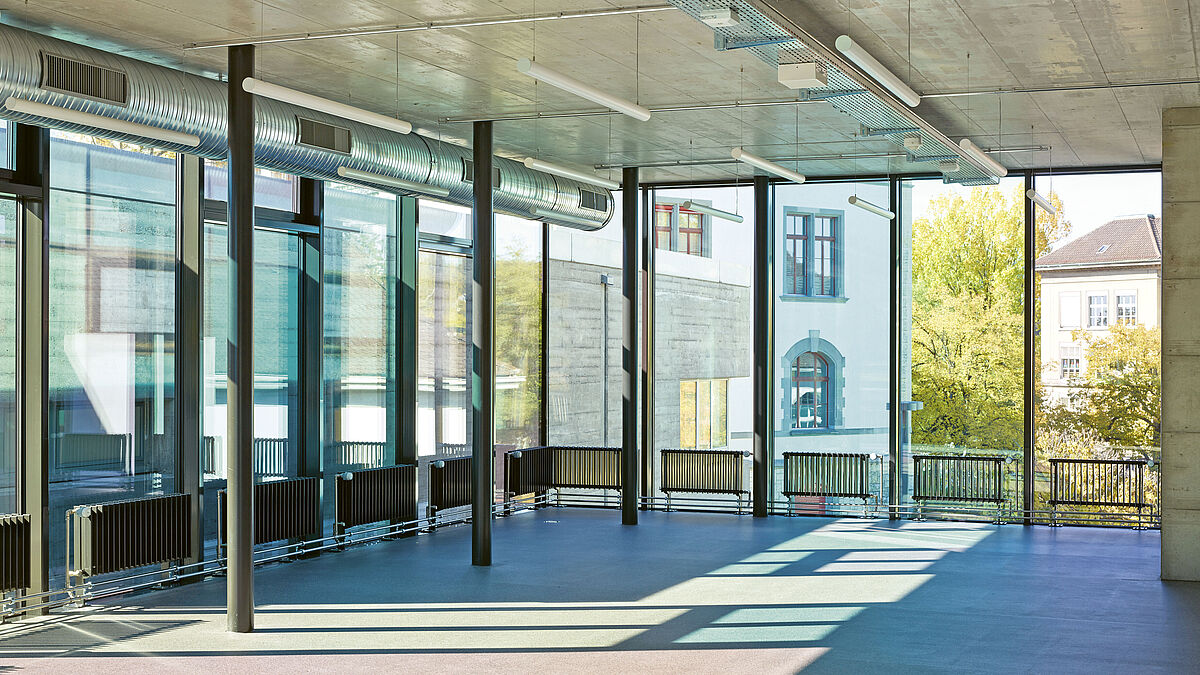 L’extension étroite de deux étages des architectes Schnelli Meier Blum, de Schaffhouse, se glisse désormais avec respect entre les deux bâtiments existants imposants. Ses volumes clairs nettement découpés et le choix des matériaux assumé lui confèrent son caractère propre.