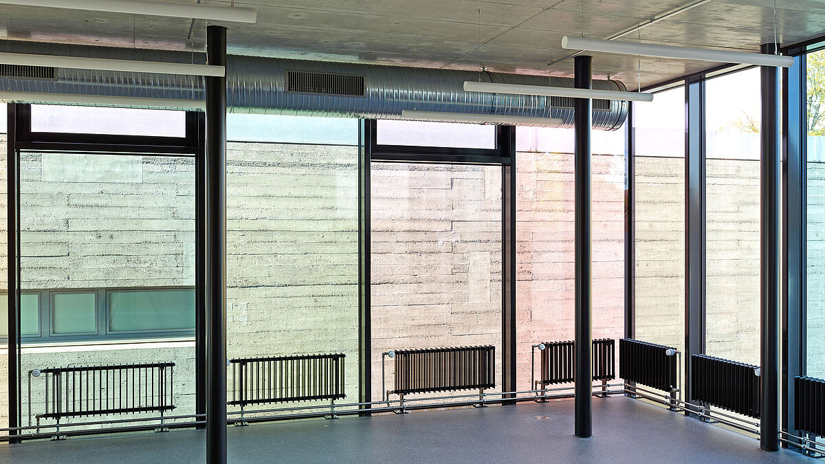 En plan, la façade en verre réalisée par Pletscher Metallbau AG, à Schleitheim, présente une forme de U. Elle s’étend sur deux étages, l’étage supérieur surplombant l’étage inférieur dans le sens de la longueur. Différents changements de direction et décalages créent la forme en U mentionnée. La cantine est desservie par une grande porte à double battant et est reliée aux locaux techniques par deux portes à un battant.