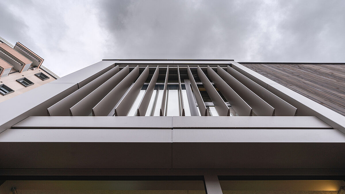 Mais l’élément qui distingue particulièrement ces façades est l’intégration de systèmes d'ombrage verticaux, inspirés par la forme élégante et aérodynamique d'une aile d'avion. Ce choix technique et esthétique ne vise pas uniquement à rehausser l’apparence de l’édifice, mais également à offrir une solution innovante pour la gestion de la lumière et de la chaleur. Les lames brise-soleil en aluminium permettent de contrôler efficacement l’apport lumineux tout en garantissant une isolation thermique performante.