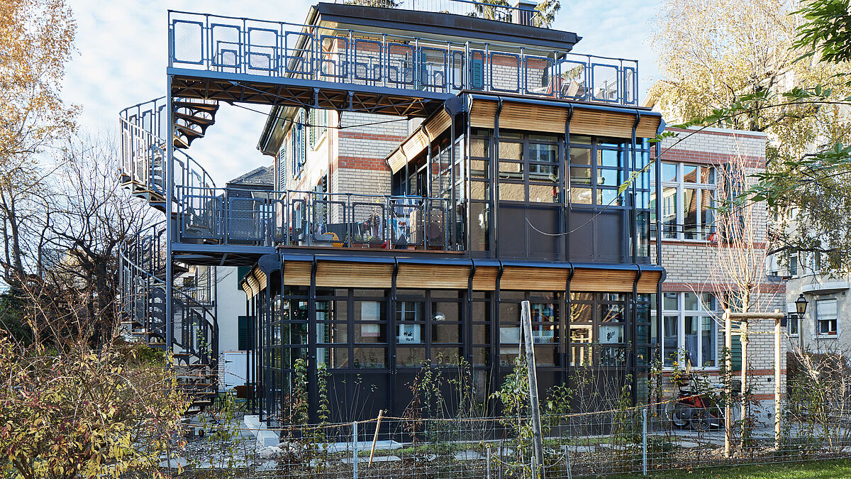 Cette construction est née de la volonté du maître d’ouvrage de concevoir le bâtiment comme un projet résidentiel collectif, en cherchant à permettre aux trois logements superposés d’accéder directement au jardin et de se réunir. Le résultat emprunte finalement aux bâtiments industriels historiques. L’idée était de réaliser un atelier, en s’inspirant en particulier des réalisations de Jean Prouvé. Son esthétique est le fruit d’un savant mélange entre les architectes, le maître d’ouvrage et l’artisan et ferronnier d’art Gregor Portmann, qui a réalisé un escalier hélicoïdal, une balustrade et une passerelle. L’artiste Maja Thommen a, pour sa part, réalisé une sculpture pour la façade extérieure de l’extension. Tous trois créateurs, Niklaus Leuthold, Gregor Portmann et Maja Thommen sont liés par une histoire commune. Aux dires des architectes, l’esthétique, les formes et matériaux de l’extension reflètent de nombreuses réminiscences et allusions au mouvement punk et aux squats des années 90, ainsi qu’aux subcultures associées des trois dernières décennies.