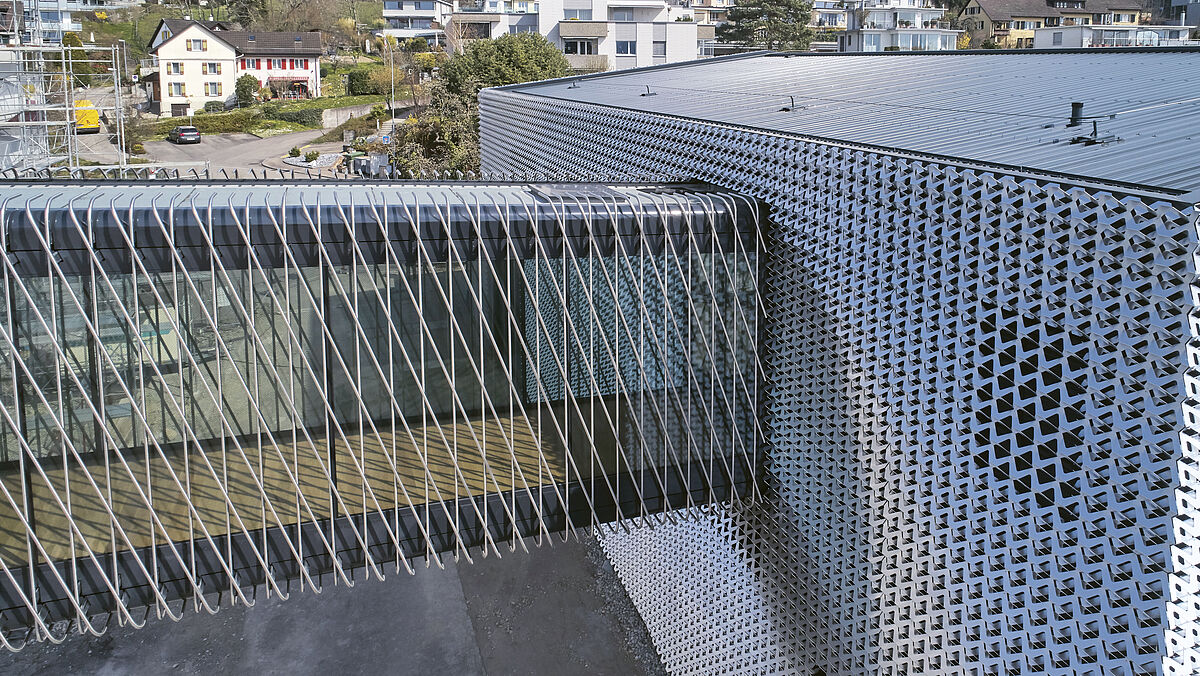 Thomas Baltensperger, propriétaire et directeur de l’entreprise de construction métallique éponyme, explique à la revue metall : « Au vu de la complexité de cet ouvrage et de son enveloppe en maillage inox, nous avons décidé d’assembler dans notre usine toute la structure porteuse, y compris les tôles profilées du sol et du plafond. Ensuite, le montage de la structure métallique a pris moins d’une journée. Procéder ainsi nous a permis de garantir les aspects techniques, mais aussi de mettre en œuvre une grande partie de notre savoir-faire directement dans nos ateliers. »