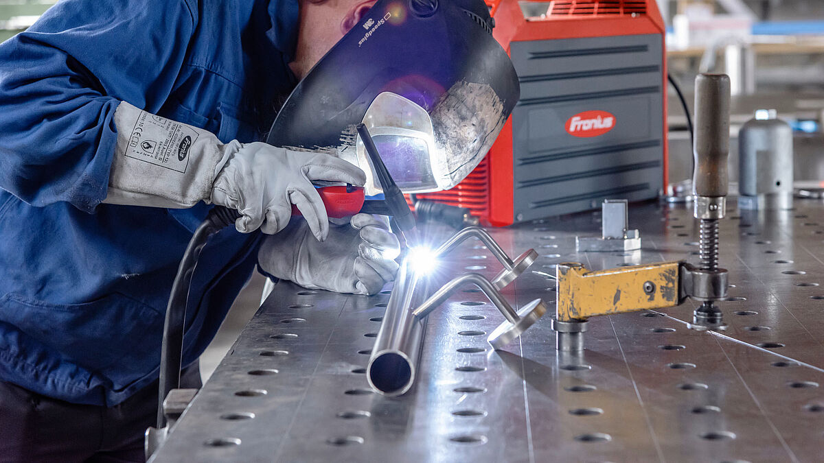 L’atelier d’acier inoxydable se trouve à quelques mètres seulement : on y travaille en t-shirt et avec des gants blancs – question de dextérité. Les membres de ce département sont des spécialistes du procédé TIG et l’on ne peut que reconnaître les qualités presque artistiques de leur travail. Actuellement, les principaux ouvrages sont des mains courantes, des huisseries de porte en acier inoxydable et des garde-corps. Les soudures visibles impeccables ont toutes été réalisées avec le MagicWave 230i ou le TransTig 230i.