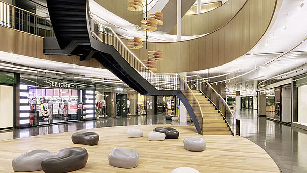 Non, non, ce n’est pas un ascenseur en verre qui mène du rez-de-chaussée aux étages supérieurs au cœur d’un centre commercial zurichois : un élégant escalier en colimaçon en acier suspendu permet aux visiteurs de se déplacer sur les quatre étages tout en faisant un peu de sport.
